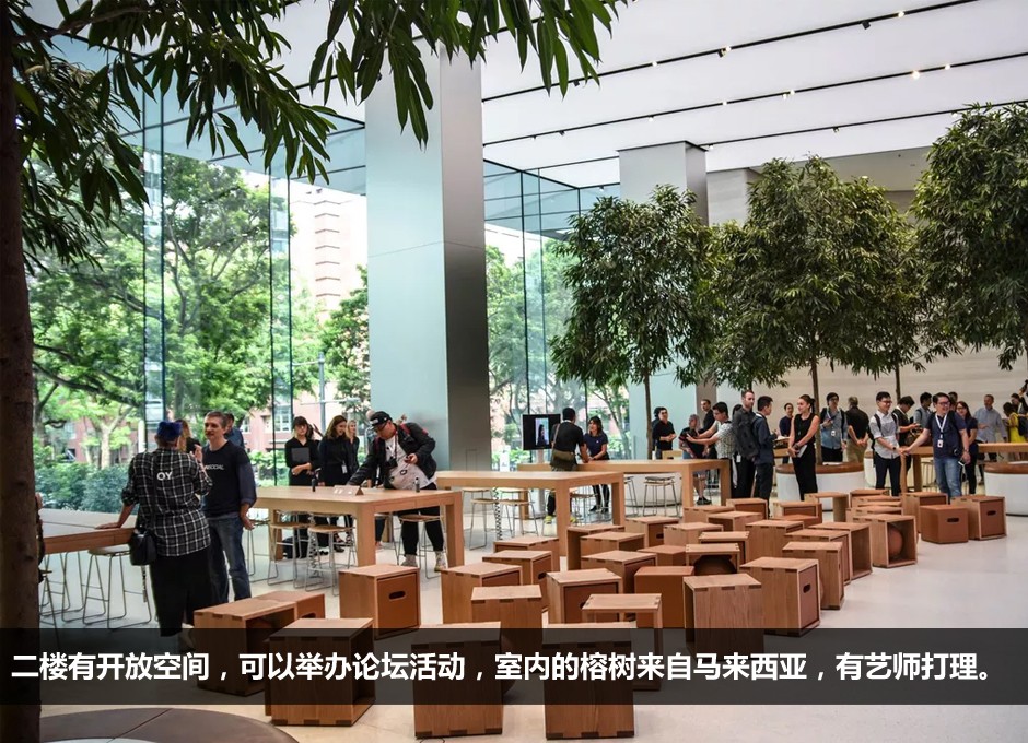和以往的苹果旗舰店涉及不同的是,这家店位于新加坡的购物中心,而且充满了“森林风格”和小清新,用媒体的话来说这是“这才是真正的环保”:室内能源百分之百可再生,装修采用的是木质栏杆和石制楼梯、室内展架和桌椅都采用的是实木,室内有马来西亚的榕树和各种花草,有专门的艺师打理、如同室内丛林一般、室内拥有良好的空气循环系统,而且每周还有摄影课和当地专家的讲座。